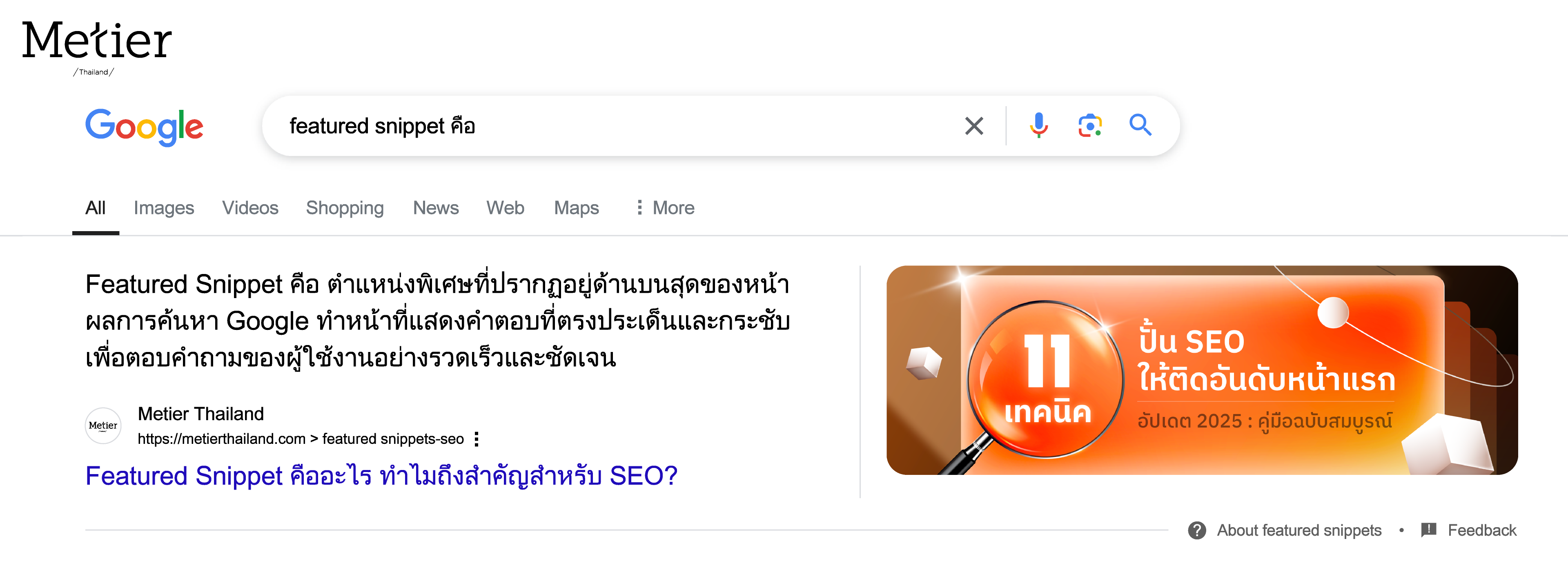 Featured Snippets คือ ตำแหน่งพิเศษที่ปรากฏอยู่ด้านบนสุดของหน้าผลการค้นหา Google ทำหน้าที่แสดงคำตอบที่ตรงประเด็นและกระชับ เพื่อตอบคำถามของผู้ใช้งานอย่างรวดเร็วและชัดเจน การที่ Google เลือกเนื้อหาของเว็บไซต์ไปแสดงในตำแหน่งนี้ขึ้นอยู่กับการสร้างเนื้อหาที่ตอบโจทย์การค้นหาอย่างสมบูรณ์ เช่น การอธิบายความหมาย (Definitions) หรือการจัดอันดับคอนเทนต์ที่ชัดเจน (Lists) ด้วยการปรับแต่งเนื้อหาให้ตอบคำถามที่พบบ่อย