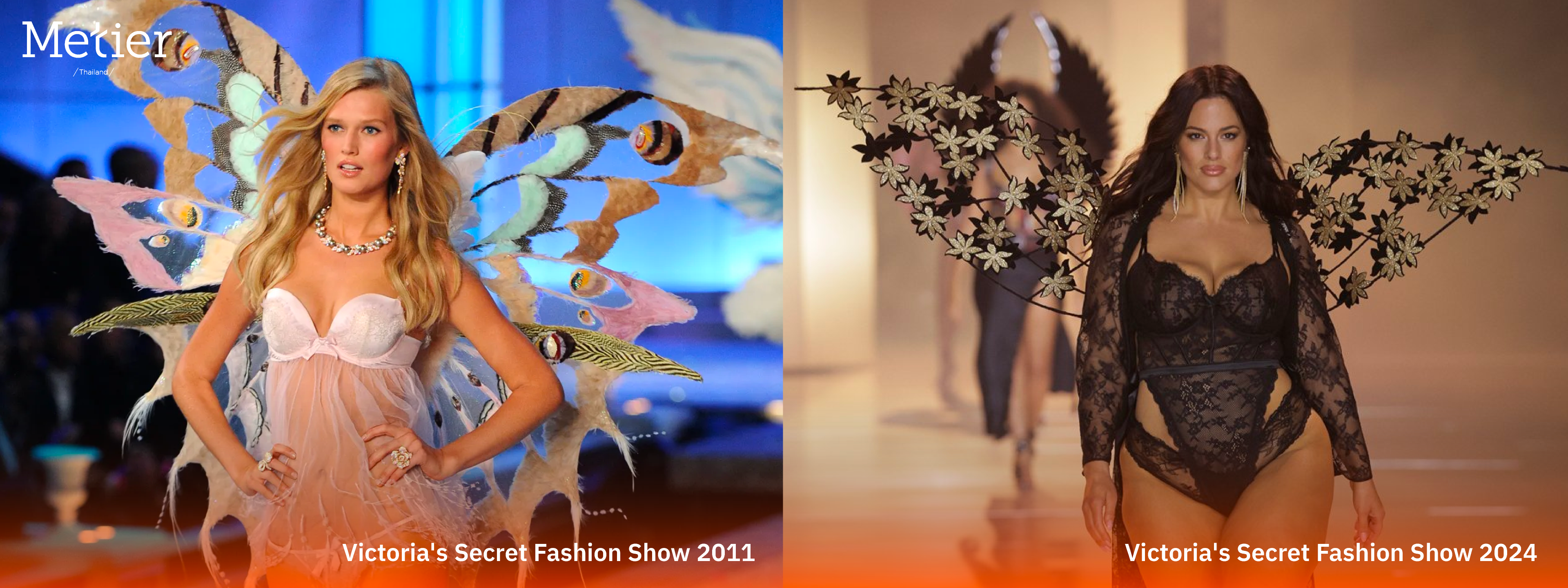 ตัวอย่างเช่น Victoria’s Secret มีการรีแบรนด์ใหม่ ที่เน้นย้ำถึงความหลากหลายผ่านแคมเปญ "VS Collective" เพื่อลบภาพจำของนางฟ้าหุ่นผอมเพรียว ซึ่งเคยเป็นจุดขายหลักของแบรนด์มาก่อน โดยเปลี่ยนมาใช้นางแบบที่มีความหลากหลายทางด้านเชื้อชาติ รูปร่าง อายุ และเพศ มาเดินแบบในงาน “The Victoria's Secret Fashion Show 2024” ที่ผ่านมา พร้อมทั้งปรับการตกแต่งร้านด้วยหุ่นโชว์ที่มีรูปร่างหลากหลายมากขึ้น